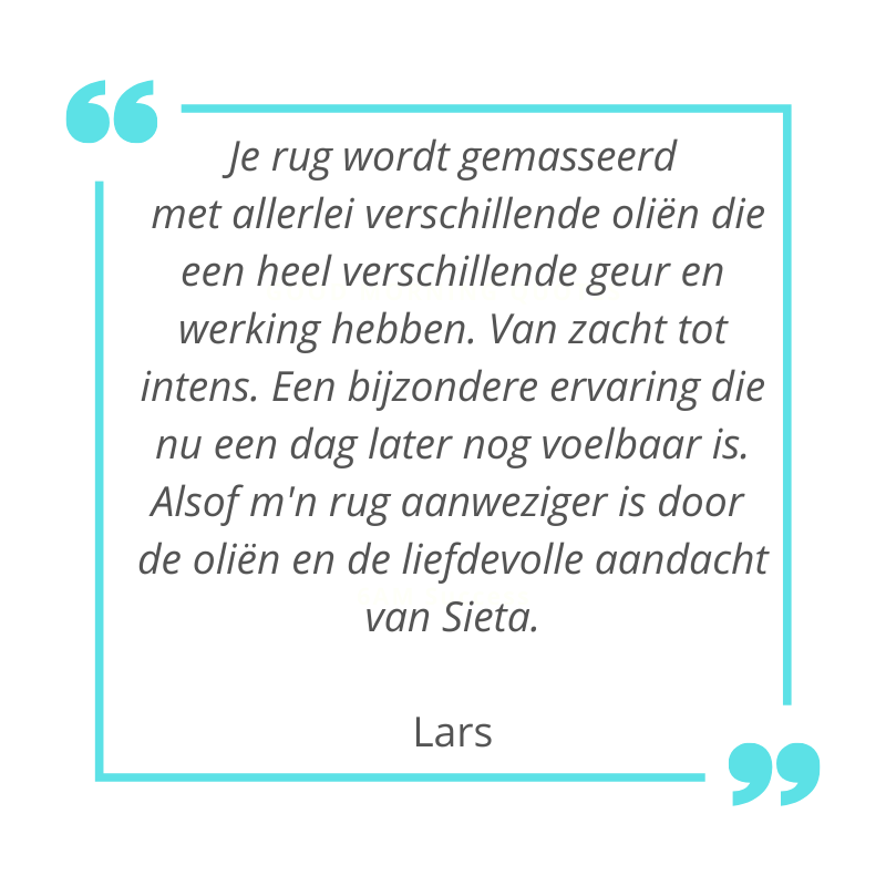 De behandeling vindt plaats op je rug, hoofd, je oren en voeten. Maar na afloop heb je het gevoel dat je hele lijf is aangeraakt. Een hele ontspannende, herstellende en weldadige behandeling!